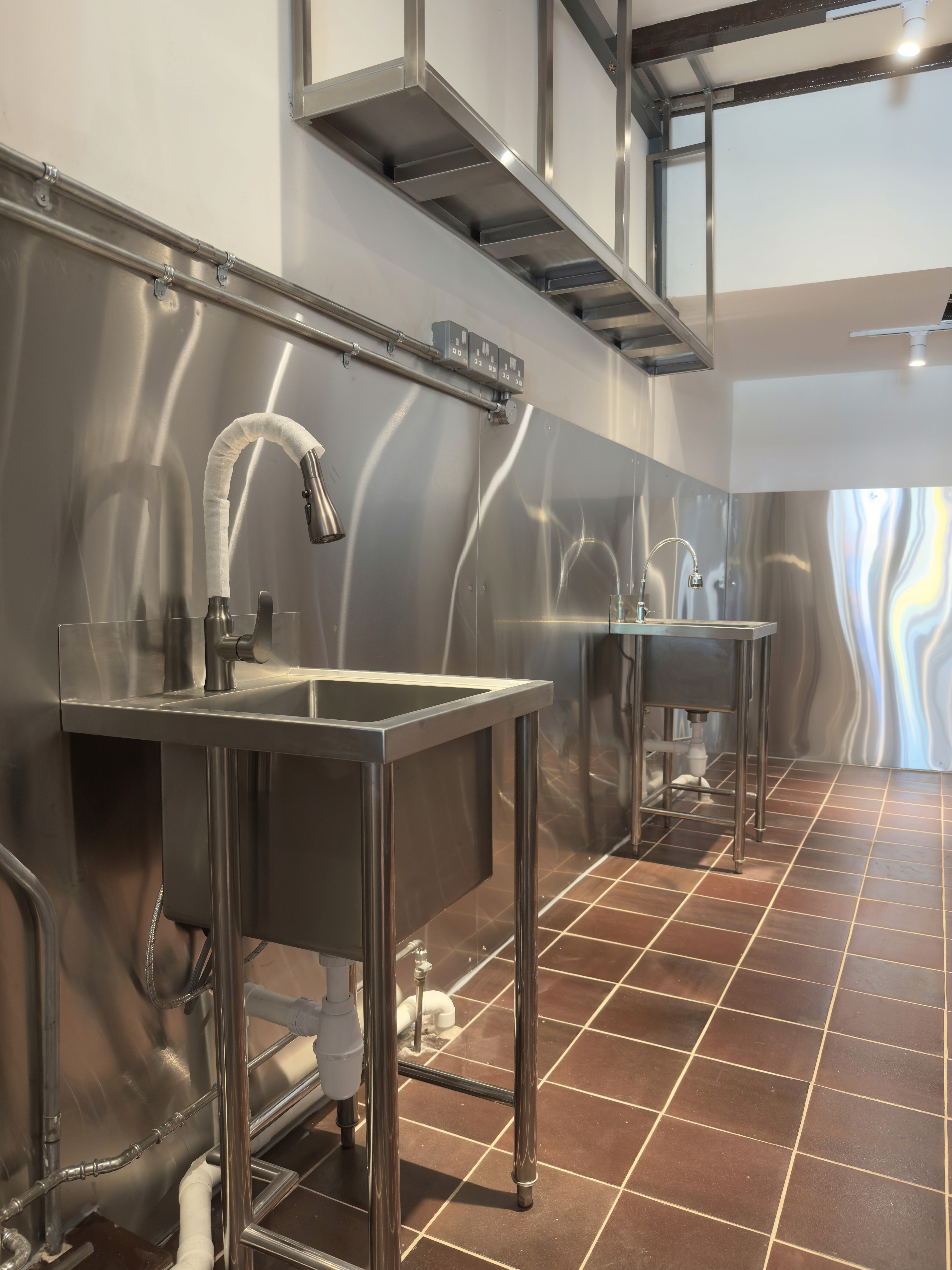 Full Kitchen setup including customized stainless steel shelving, cladding and equipment. Full M&E including plumbing, electrical & fire protection system. Full partition to separate Kitchen from dining area.